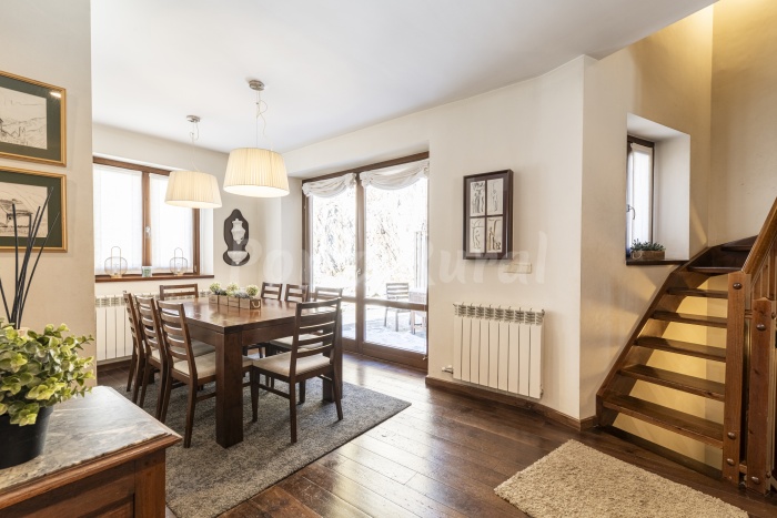 La vivienda dispone de garaje privado a nivel de calle, donde están instaladas la lavadora y la secadora, con acceso directo al interior de la casa. También cuenta con zona ajardinada común. Esta casa rural en el Valle de Tena es perfecta tanto para escapadas de montaña como para disfrutar de la temporada de esquí en Formigal.