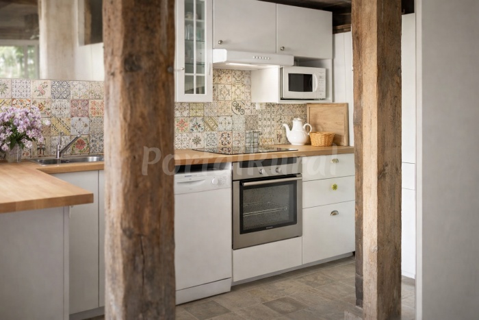 La cocina está totalmente equipada con electrodomésticos como horno, vitrocerámica, lavavajillas, frigorífico, microondas y menaje completo, preparada para estancias largas o grupos numerosos.