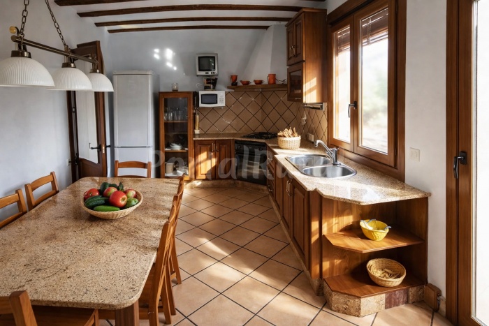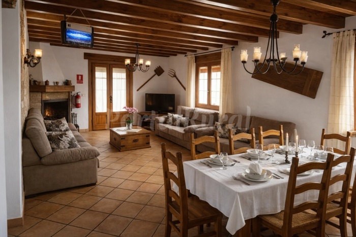 El interior incluye un amplio salón con chimenea de leña, ideal para el invierno, y una cocina totalmente equipada con lavavajillas, microondas, tostadora y todo el menaje necesario para grupos.