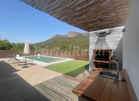 El exterior de la vivienda es uno de sus grandes atractivos. Dispone de piscina adaptada tanto para adultos como para niños, zona de solárium con césped, hamacas, barbacoa, fregadero, terraza y un porche cubierto con mesa y sillas, perfecto para disfrutar de comidas al aire libre. Además, cuenta con un amplio aparcamiento asfaltado y acceso directo desde la carretera. La casa dispone de aire acondicionado en el salón y en varias habitaciones, así como conexión a internet, garantizando una estancia cómoda y funcional.
