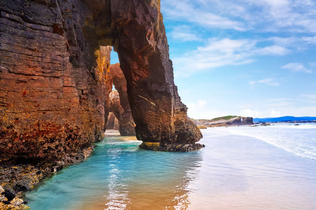 El punto final natural de la ruta es la Playa de las Catedrales, en el municipio lucense de Ribadeo: arcos y cuevas esculpidas por el Atlántico en la roca que en bajamar forman una catedral natural. Requiere reserva previa en temporada alta y vale cada trámite burocrático. Una advertencia honesta: el tiempo en la cornisa cantábrica es impredecible incluso en julio. Poncho en el maletero, siempre.