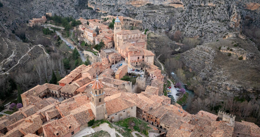 Albarracín es la primera parada y también la más conocida de las cinco. Muchos la consideran el pueblo más bonito de España, y la primera vista desde la carretera de acceso —la villa medieval de color rojizo construida sobre un meandro del río Guadalaviar, con murallas árabes que se funden con la roca del cerro— da argumentos para defender esa posición. Conviene quedarse a dormir: de día recibe autobuses y excursionistas; de tarde-noche, con las calles casi vacías y la luz cambiando sobre las fachadas rojizas, es otro pueblo.