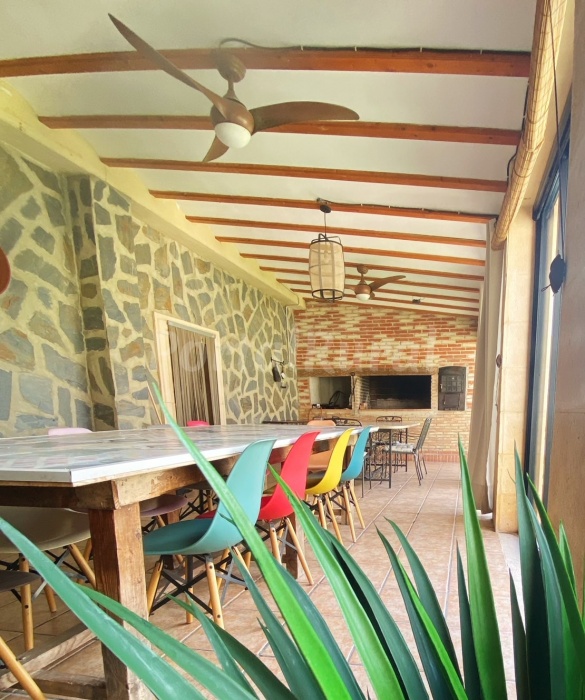 El interior dispone de un gran salón con chimenea y zona de bar, perfecto para reuniones en grupo, así como una cocina totalmente equipada, zona de office y comedor que facilitan una estancia cómoda y funcional.